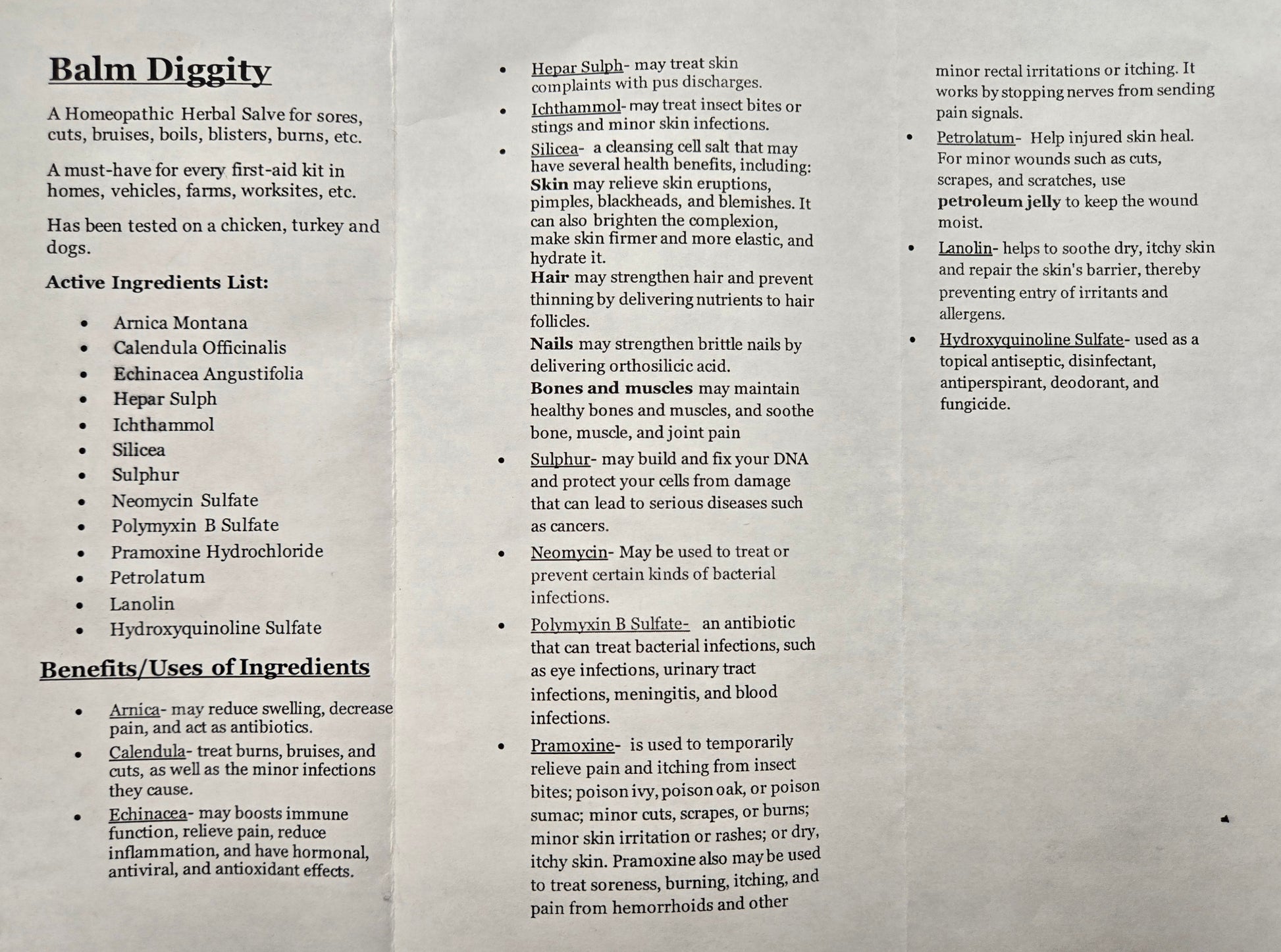 A homeopathic herbal salve for sores, cuts, bruises, boils, blisters, burns, etc.